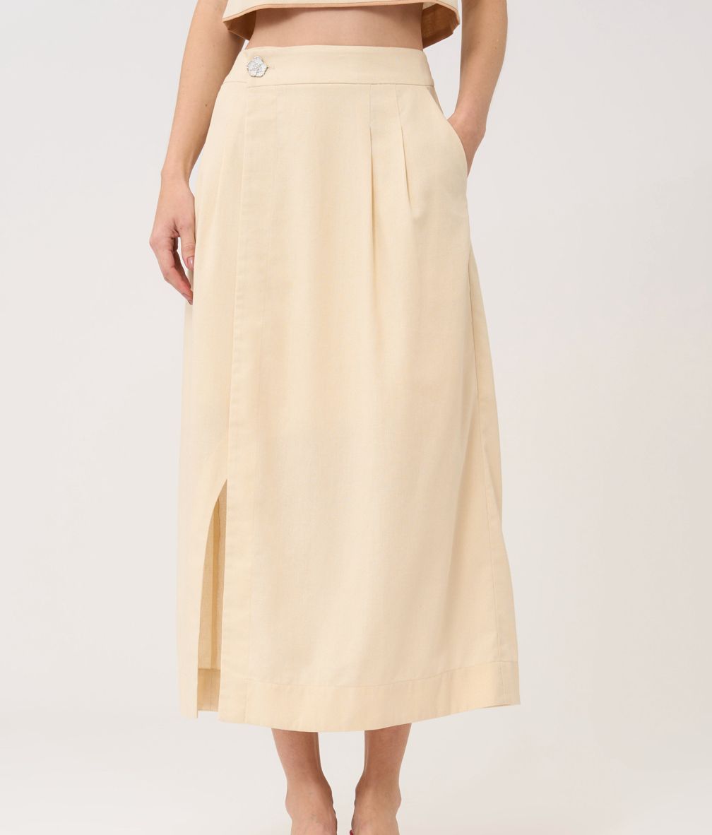 Saia midi com transpasse frente e fechamento com botão personalizado em forma de flor.