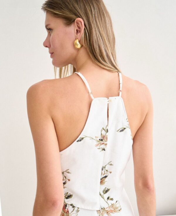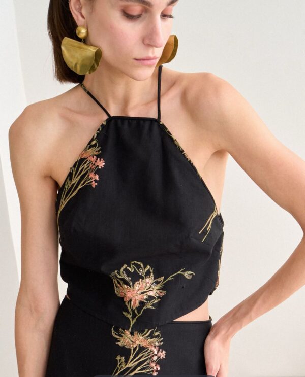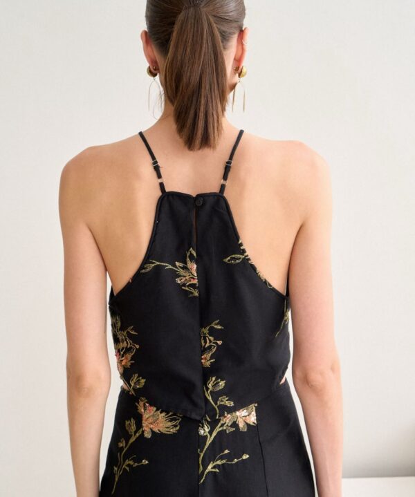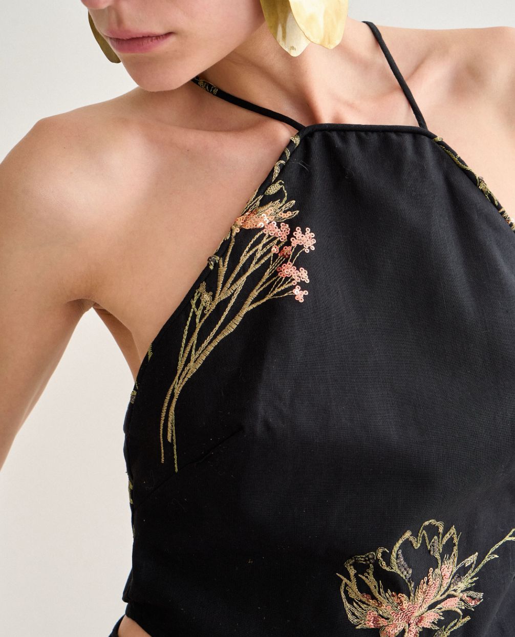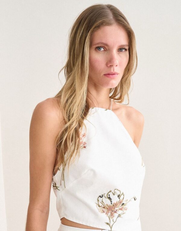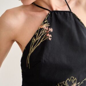 Em até 6x de R$33,32 sem juros Tecido de linho misto com bordado floral em linha e paetês;