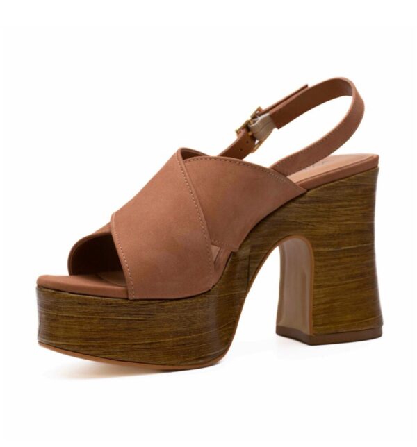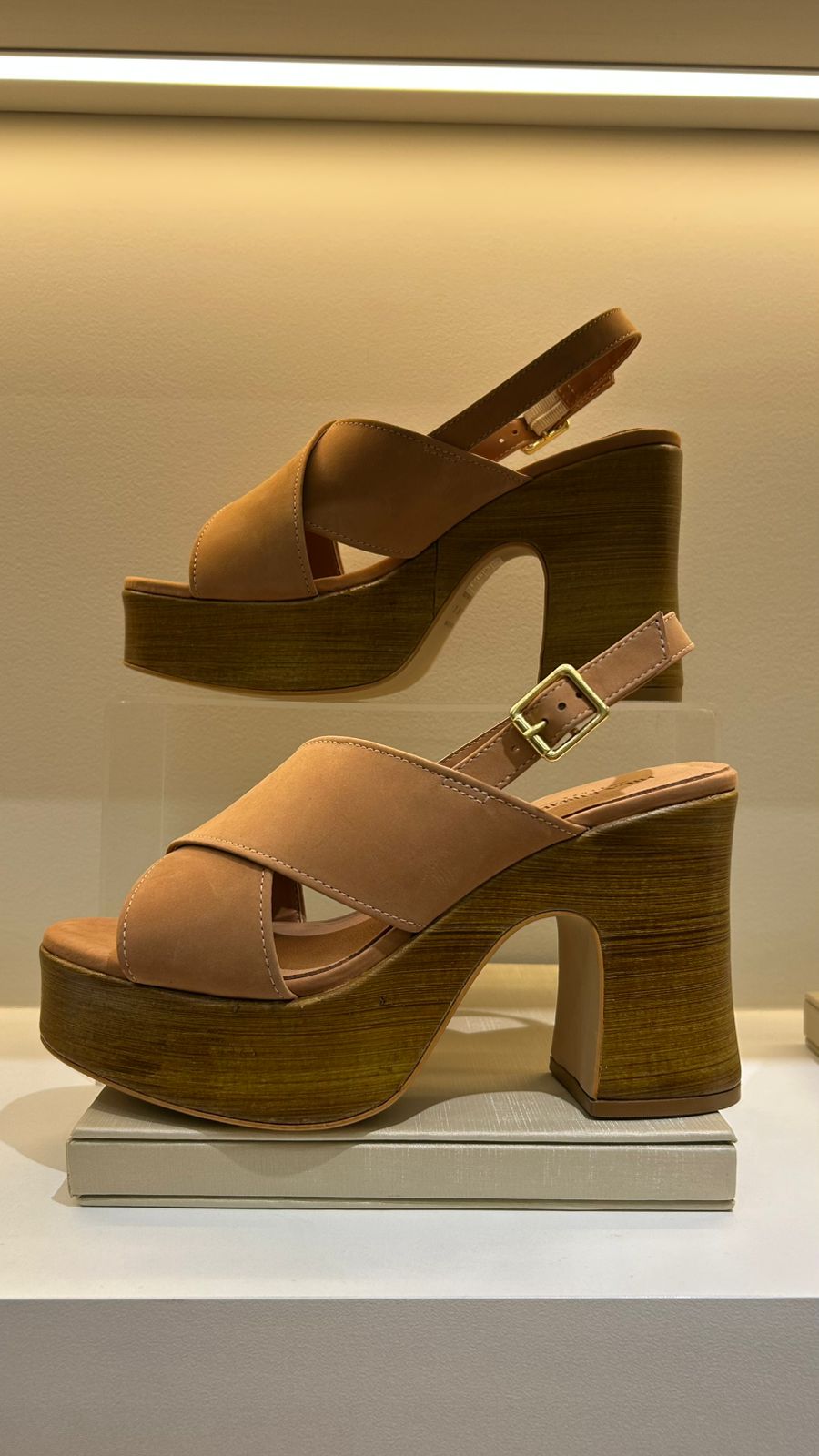 A cor desse modelo é um tom de marrom em material nobuck (camurça), plataforma forrada em madeira natural e palmilha em couro.